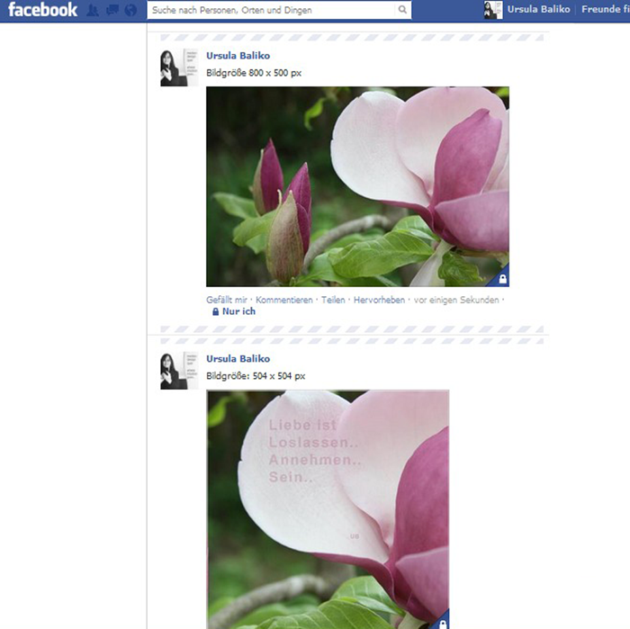Hier noch als Vergleich, wie ein 504 x 504 px Bild und ein 800 x 500 px Bild auf der Startseite bei Facebook aussieht: