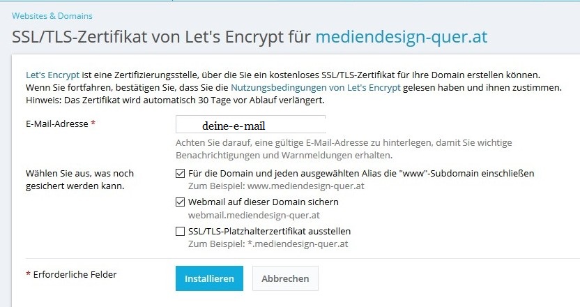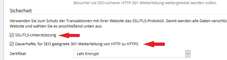 Das zweite Häkchen ist wichtig für den Browser. Sonst wird dir vom Browser die http Version – also die nicht sichere Version – angezeigt.
