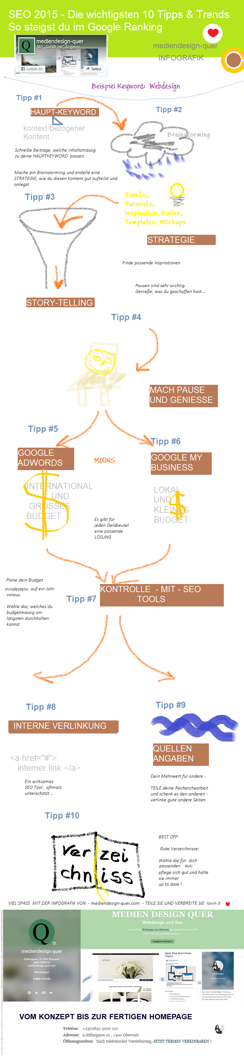 SEO 2015 – 10 wichtige Tipps – wie es möglich ist, im Google Ranking nach vorne zu kommen. In einer Grafik zusammengefasst.