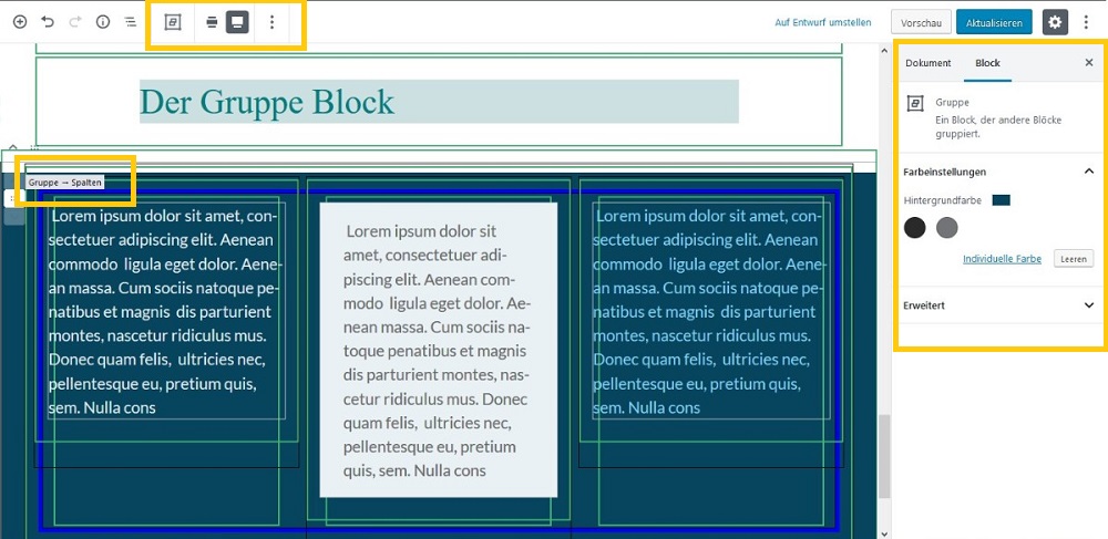 Gruppe Block mit drei Spalten und Hintergrundfarbe im Backend