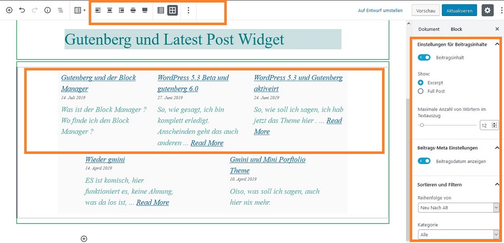 Es wurden bereits bestehende Widgets nach Gutenberg gebracht. Zum Beispiel das Latest Post Widget. Da das Konzept Widgets schon integriert ist, kannst du nun diese Widgets an jeder Stelle deines Themes, welches Widgets unterstützt, ausgeben.
