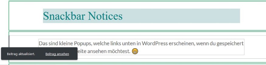 Wenn du einen Beitrag gespeichert oder aktualisiert hast, popt links unten obiges graues Feld auf. Dabei kannst du auch auf den Link > Beitrag ansehen klicken . Dieser war bisher ganz oben in der schwarzen Titel Leiste .