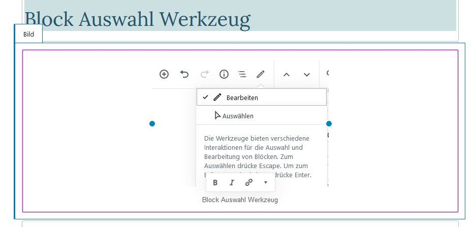 Es gibt ein neues Block Auswahlwerkzeug in der oberen Werkzeugleiste. Wenn du einen Block auswählen möchtest, brauchst du nur auf das Auswählen Werkzeug klicken und danach in den Block, welchen du wählen möchtest.