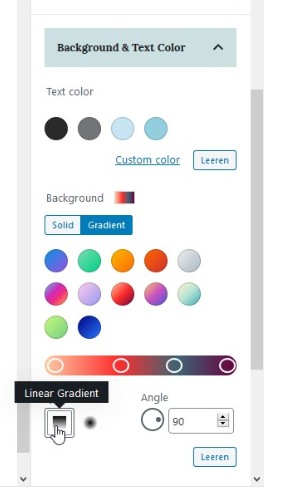 Wenn du ein eigenes WordPress Theme hast, dann kannst du hier noch über die functions.php fertige eigene Farbverläufe hinzufügen, welche auf deine Theme Farben abgestimmt sind. Damit ersparst du dir das Einstellen neuer Farbverläufe in der Block Sidebar.