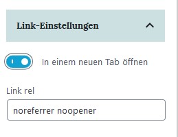 Du kannst für Links zusätzlich beim Buttons Block auswählen, ob der Link in einem neuen Fenster geöffnet werden soll. Dann ist wie oben, der Button blau. Zusätzlich steht dann noch unter > Link rel noreferrer noopener . Das ist ein einfacher Schutz, den WordPress hinzufügt, damit beim öffnen im neuen Fenster keine Sicherheitslücke entsteht.
