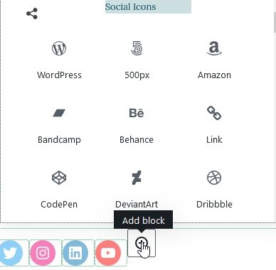 Rechts neben dem letzten Social Icon ist ein Plus im Kreis. Wenn du draufklickst, öffnet sich ein Drop Up Menü. Dort findest du alle nur erdenklichen Social Icon Blocks. Einfach deine gewünschten auswählen und deinen Style dazu nehmen.