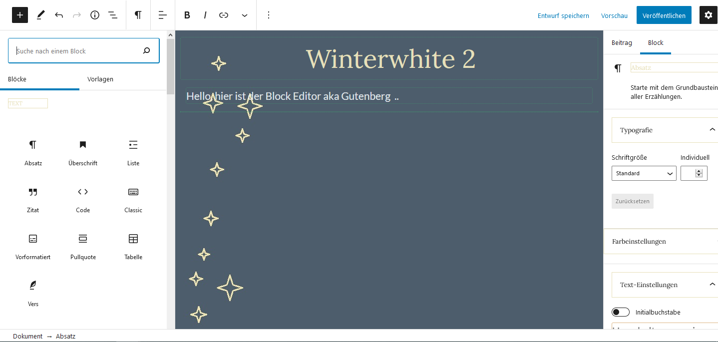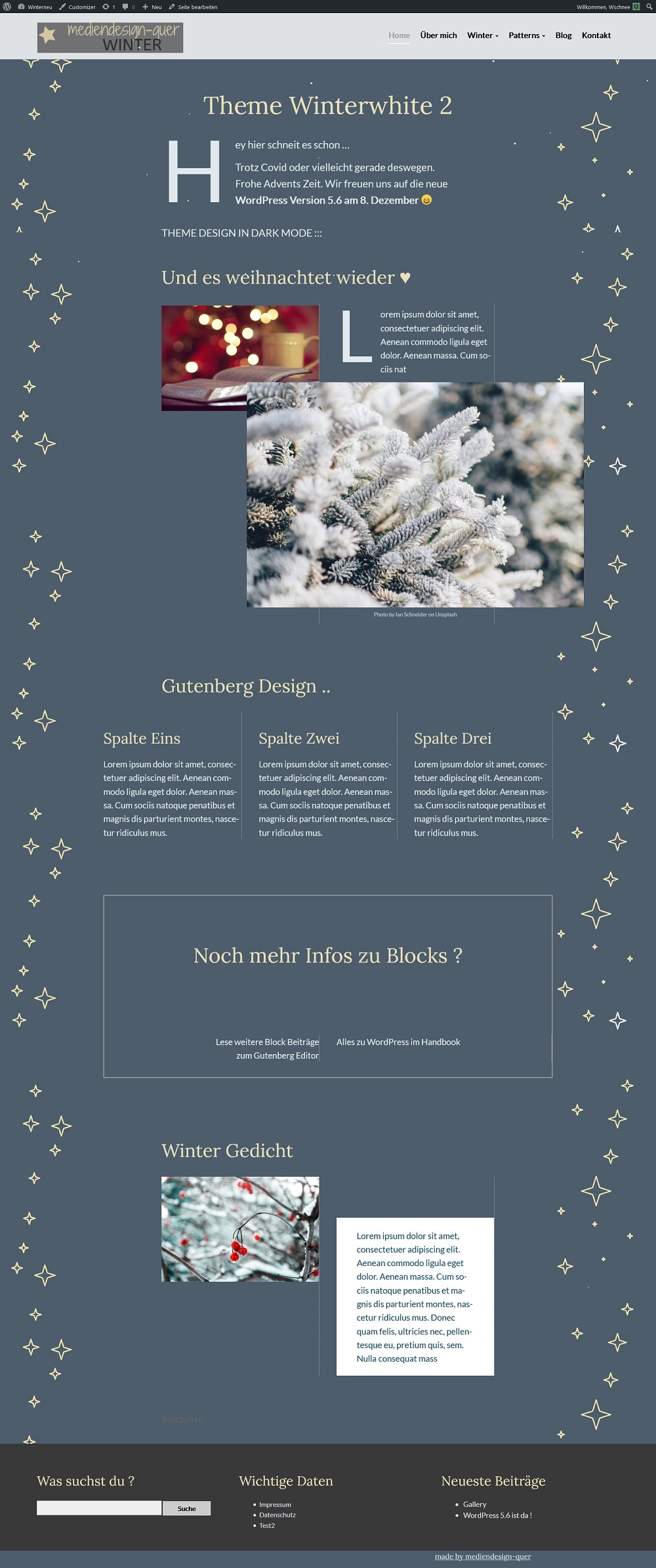 Zwei Jahre später ist das Backend des Theme Winterwhite sozusagen völlig zerschossen. Zu viel waren die laufenden Änderungen, welche der Gutenberg Editor erfahren hatte 😅. Aber, Weihnachten ist immer eine coole Zeit und mir gefällt es dann immer, ein schönes Weihnachts Theme zu haben. 😄.