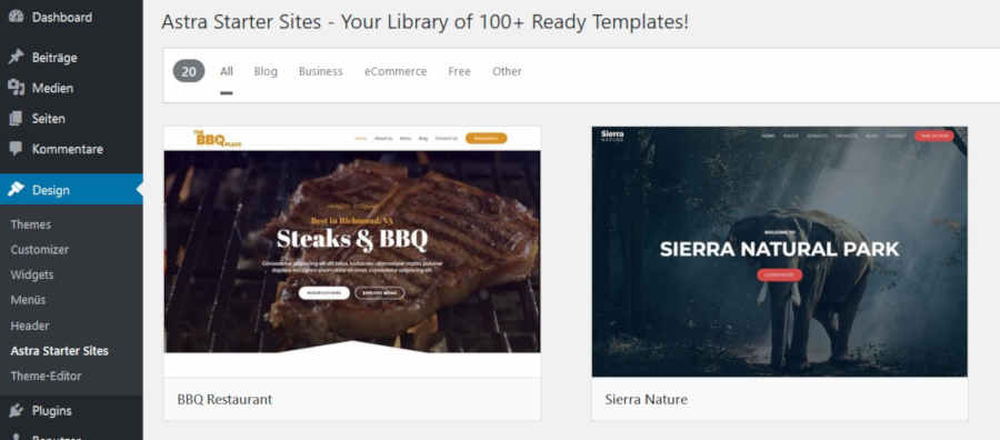 Du kannst einfach das Plugin: Astra Starter Sites importieren. Das Plugin schlägt dir dann vor, dass du auch das WordPress Theme Astra installieren solltest. Das kanst du ruhig machen. Damit werden noch ein paar weitere Plugins installiert.
