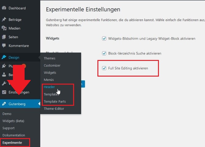 Zur Zeit sind wir bei WordPress Gutenberg Plugin Version 7.0. Wenn du dieses installiert hast, dann kannst du unter > Gutenberg > Experiences ein Häkchen machen bei > Full Site Editing.