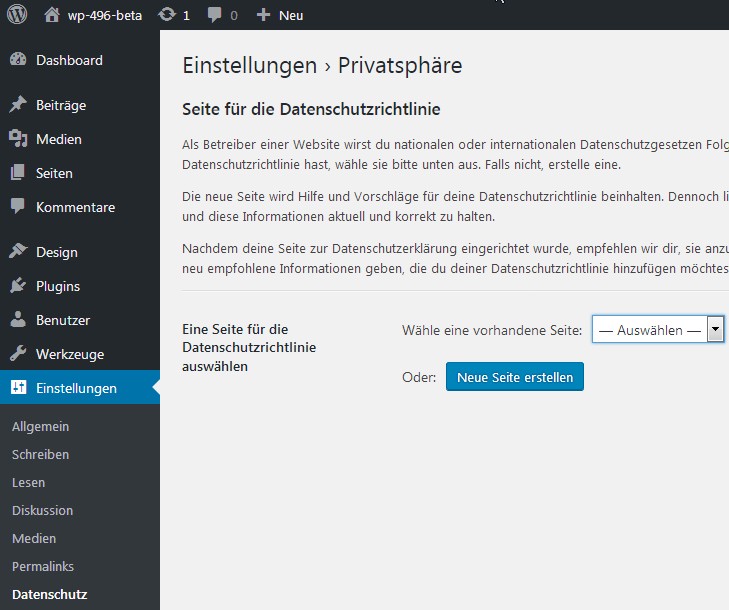 Als erstes fällt auf, dass WordPress dem Datenschutz eine eigene Seite widmet. Diese findest du unter
