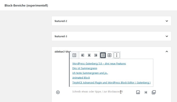 Hier im Bild oben siehst du einen Beitrags Block und einen leeren Paragraph Block. Du kannst im Widget Menü jeden beliebigen Block in deine vorhandenen Widgets hinzufügen und damit deine Widgets bearbeiten und updaten.