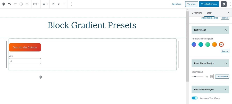 Dabei handelt es sich um Farvberläufe für den Button Block. Presets, weil die Farbverläufe voreingestellt sind. Diese gab es schon in der WordPress Gutenberg Version 6.7. Allerdings war es mehr Spielerei und es gab noch kein add_theme_support .
