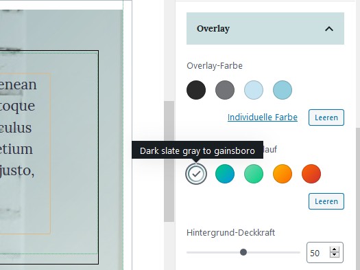 Diesen Farbverlauf gibt es zur Zeit nur mit Kombination von dem Gutenberg Plugin. Das heisst nur mit aktivierem Gutenberg Plugin wird dir dein Custom Farbverlauf im jeweiligen Block rechts in der Sidebar auch angezeigt.