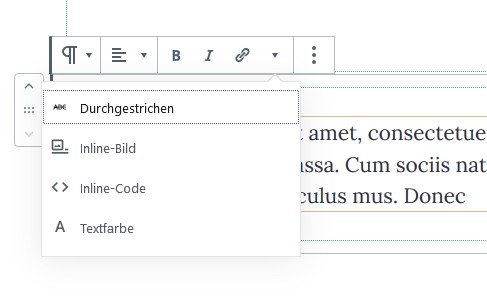 Einfach einen Paragraph Block öffnen und einen Text hinzufügen. Dann irgendwo in der Mitte des Textes den Cursor hineinsetzen. Dann gehe in der Block Werkzeugleiste auf das kleine Dreieck und dann auf > Inline Bild.