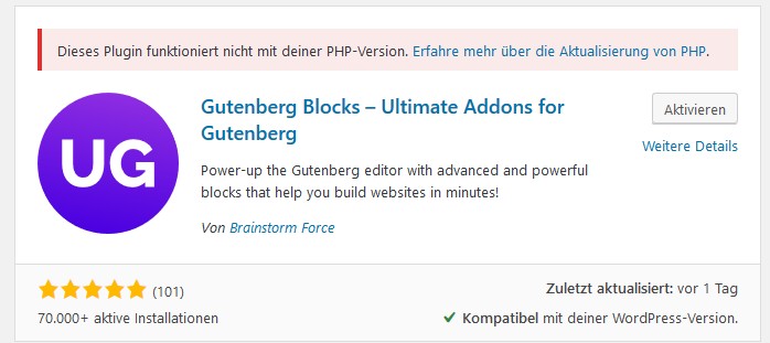 Ebenfalls siehst du nach der Plugin Installation einen Hinweis, der dir sagt, dass dieses Plugin mit deiner PHP Version nicht funktioniert: