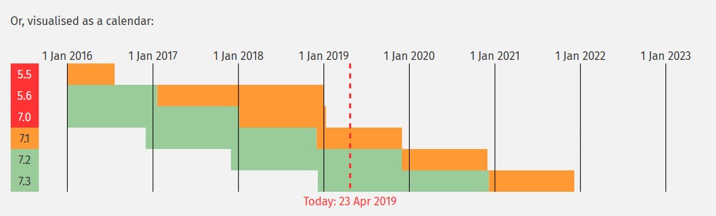 Also, jetzt ist PHP 5.6 das Minimum, aber schon Ende 2019 wird PHP 7.+ das Minimum sein, und das wird sein PHP 7.2 und 7.3.