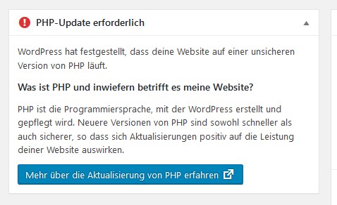 Ab der Installation von WordPress 5.1 siehst du im Dashboard obigen Aufruf zum PHP Update, falls deine WordPress Installation eine PHP Version laufen hat von 5.2-5.5.