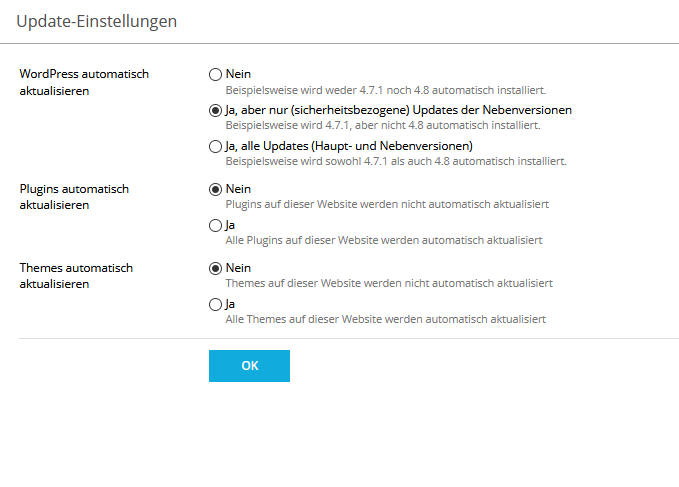 Noch einfacher geht das zum Beispiel, wenn dein Hoster Plesk als Bedienoberfläche installiert hat. Dort kannst du nämlich die WordPress Updates direkt auf Server Ebene einstellen und deaktivieren. Eine coole Sache 😉
