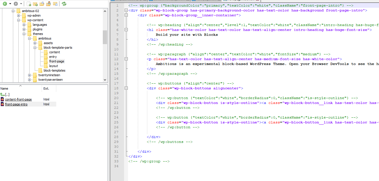 Code front-page-intro.html: Block Based experimentelles Theme Ambitious