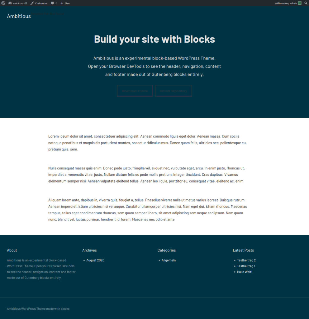 Im Vergleich zu vor sechs Monaten funktioniert der Website Editor ( Beta ) schon erstaunlich gut. Vorausgesetzt, man hat – wie in diesem Fall das Ambitious – ein Block Based Theme.
