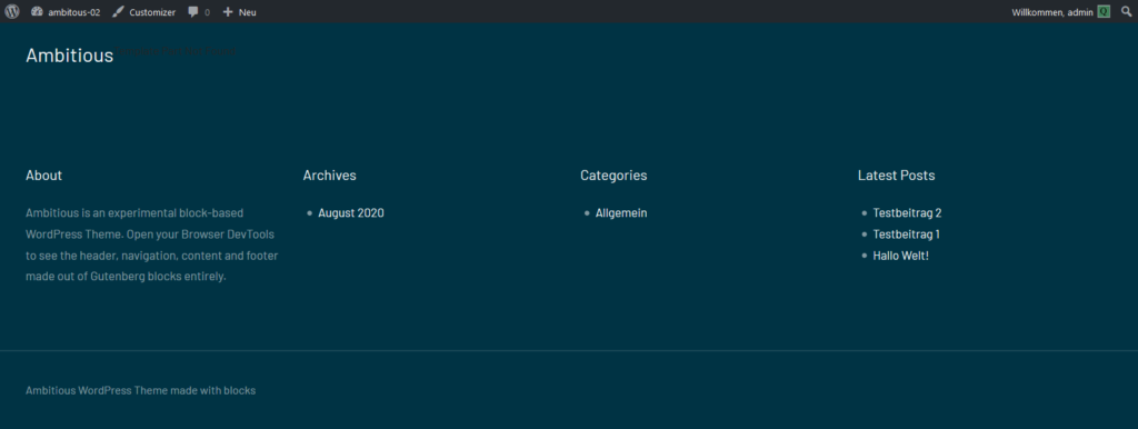 Wenn du das Theme aktiviert hast und in das Front End gehst, dann solltest du eine leere Seite sehen. Wenn du siehst – template part not found – dann hast du ein Typo drinnen. Das ist bei allen Themes. Nämlich ein Abstand zu viel bei jeder Code Zeile, im wp-template part: und zwar nach dem wp:template-part.