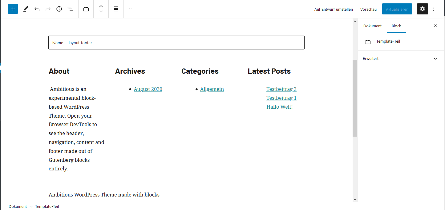 Als nächstes gehe ich wieder auf: Template-Teil und füge den Footer hinzu.