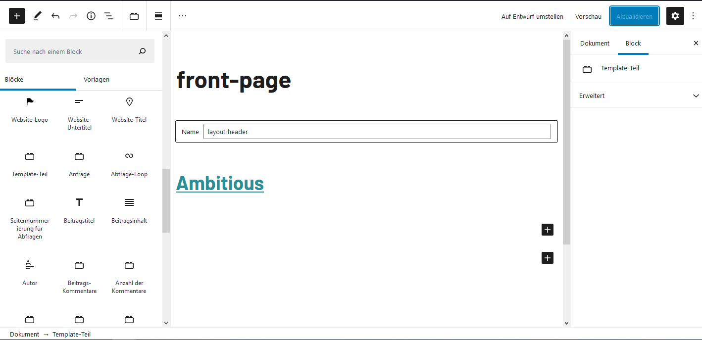 Das Block Template ist die front-page.html. Diese front-page.html im Theme Ambitious besteht aus folgenden Template Teilen: