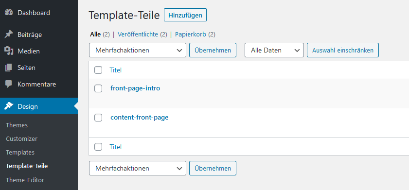 Dazu gehe einfach auf Design > Template Teile und auf > Hinzufügen. Dann gebe einen Namen ein. In diesem Fall front-page-intro. Und jetzt kannst du schon loslegen. Die verwendeten Blocks sind: