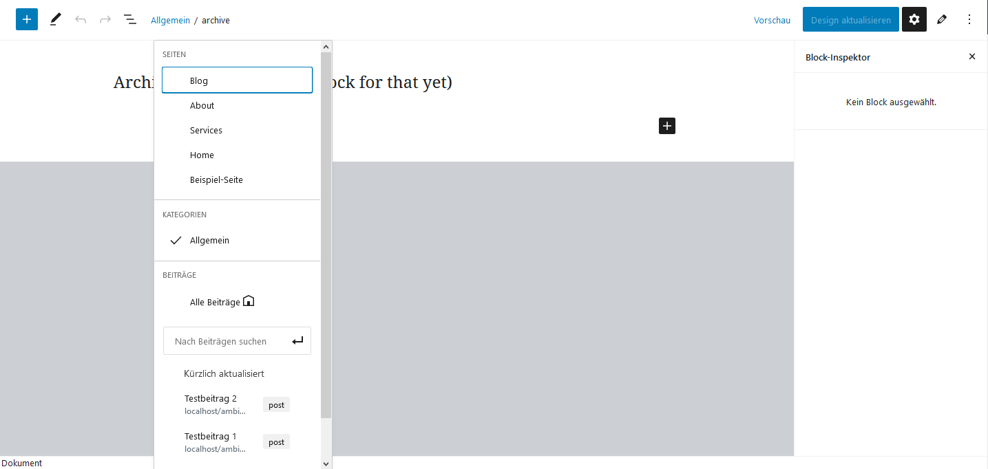 Im Bild oben siehst du auch : Allgemein / archive . Allgemein ist blau hinterlegt. das ist aktiviert und es ist die archive.html, der Block ist noch nicht vorhanden.